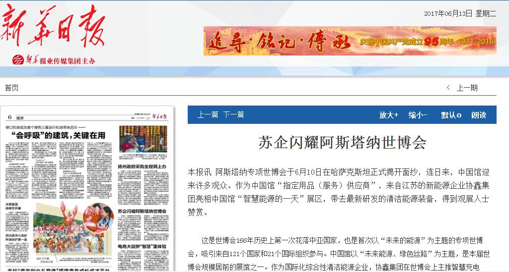 大秀清洁能源新技术新装备 江苏元素闪耀阿斯塔纳世博会