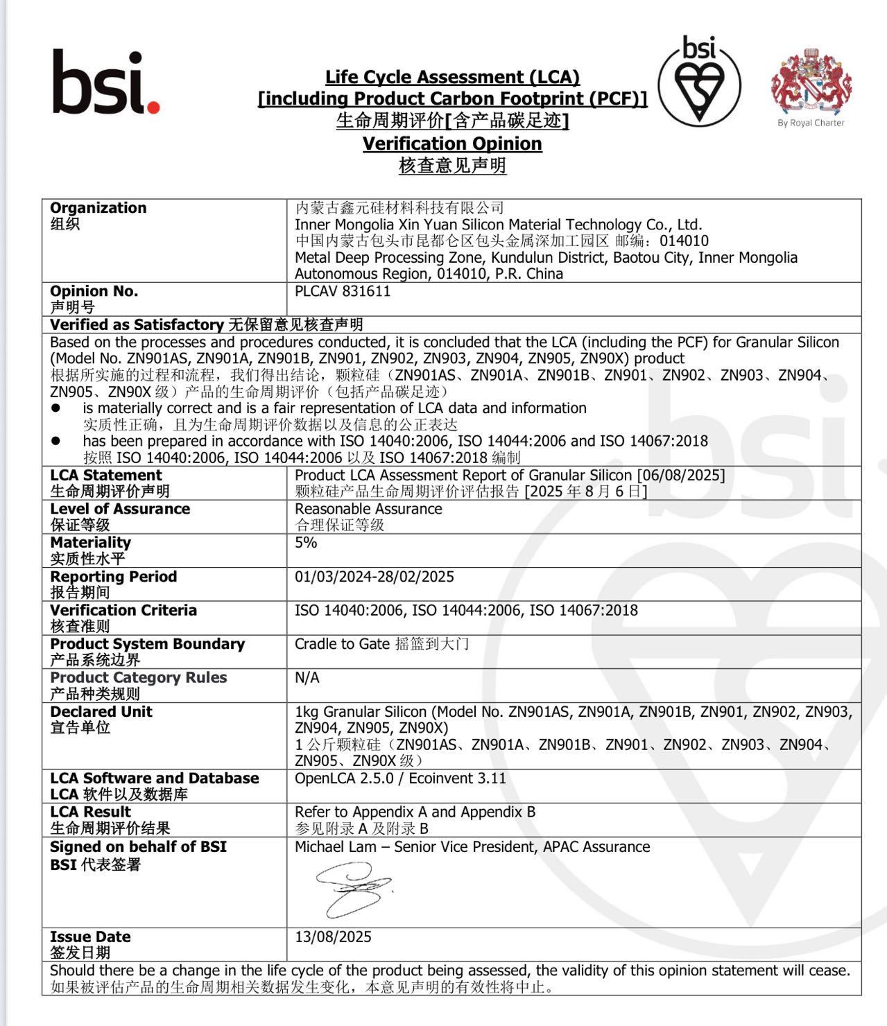 近日,协鑫科技旗下内蒙古鑫元硅材料科技有限公司(包头基地)获得国际权威认证机构英国标准协会(BSI)颁发的生命周期评价核查意见声明,公司颗粒硅产品“摇篮到大门”碳足迹仅为14.2756kgCO₂e/kg,显著低于行业平均水平,创造了硅基材料低碳生产的新纪录。