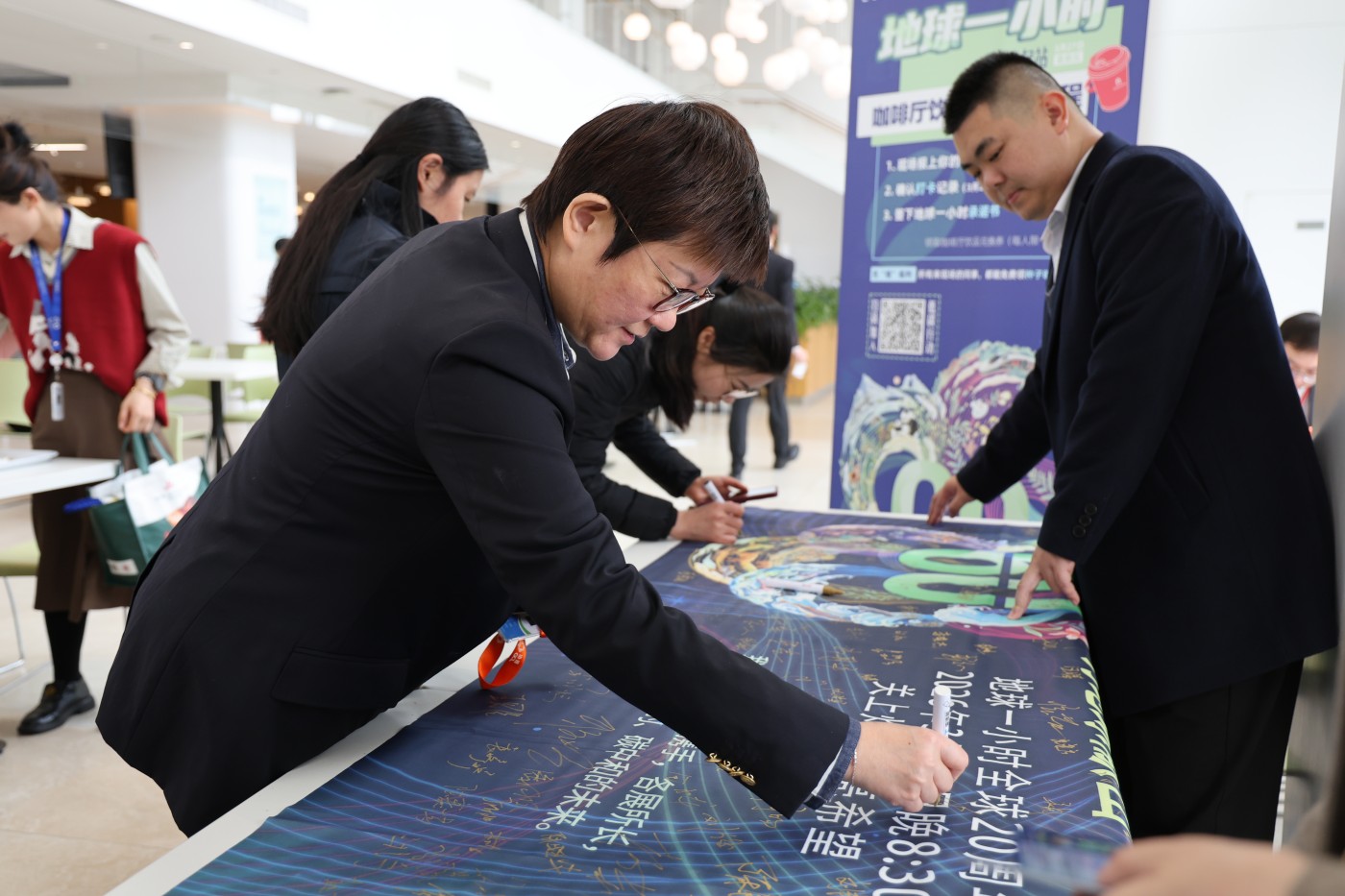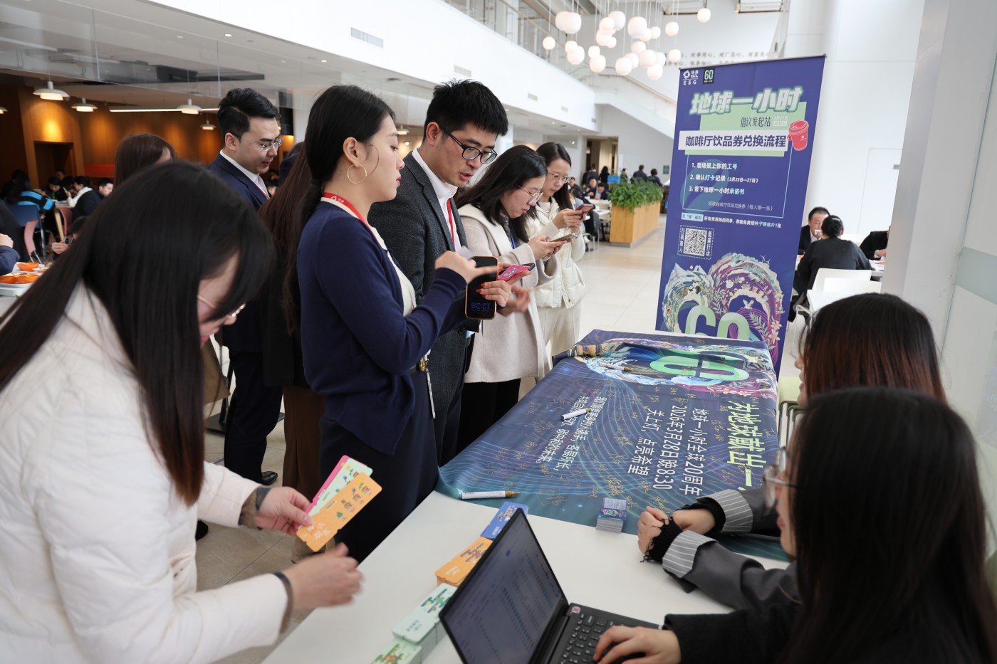 3月27日当天,协鑫能源中心二期设立“地球一小时倡议发起站”,员工现场核验工号、打卡记录并签署《地球一小时承诺书》后,即可领取饮品兑换券一张,每人限领一次。现场同步发放“种子明信片”,员工可将可种植的环保卡片带回家,寓意“绿色从一颗种子开始”。此外,员工在倡议旗上郑重签名,承诺于3月28日晚20:30—21:30关闭非必要照明与电器,以实际行动响应全球熄灯一小时倡议。