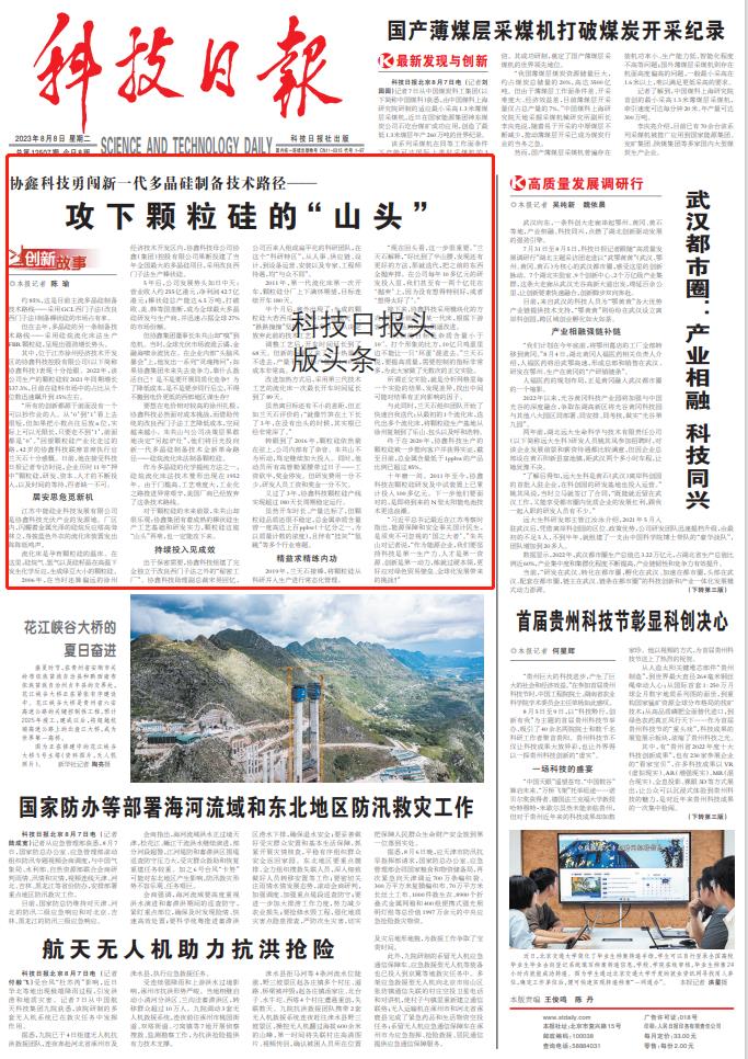 编者按:2023年8月8日《科技日报》头版头条刊发文章《协鑫科技勇闯新一代多晶硅制备技术路径——攻下颗粒硅的“山头”》关注协鑫科技颗粒硅研发之路。以下为文章全文: