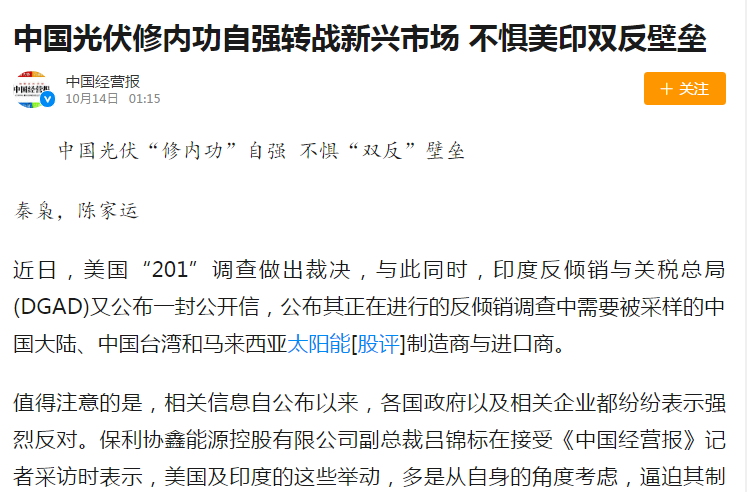 中国光伏修内功自强转战新兴市场 不惧美印双反壁垒