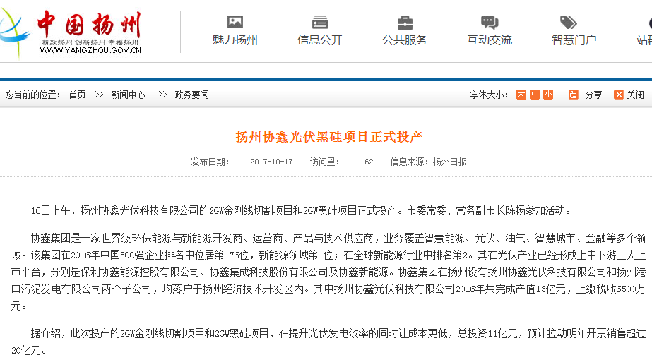 扬州协鑫光伏黑硅项目正式投产